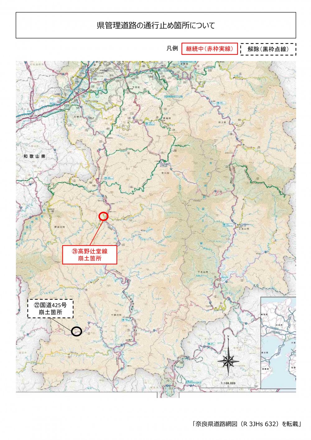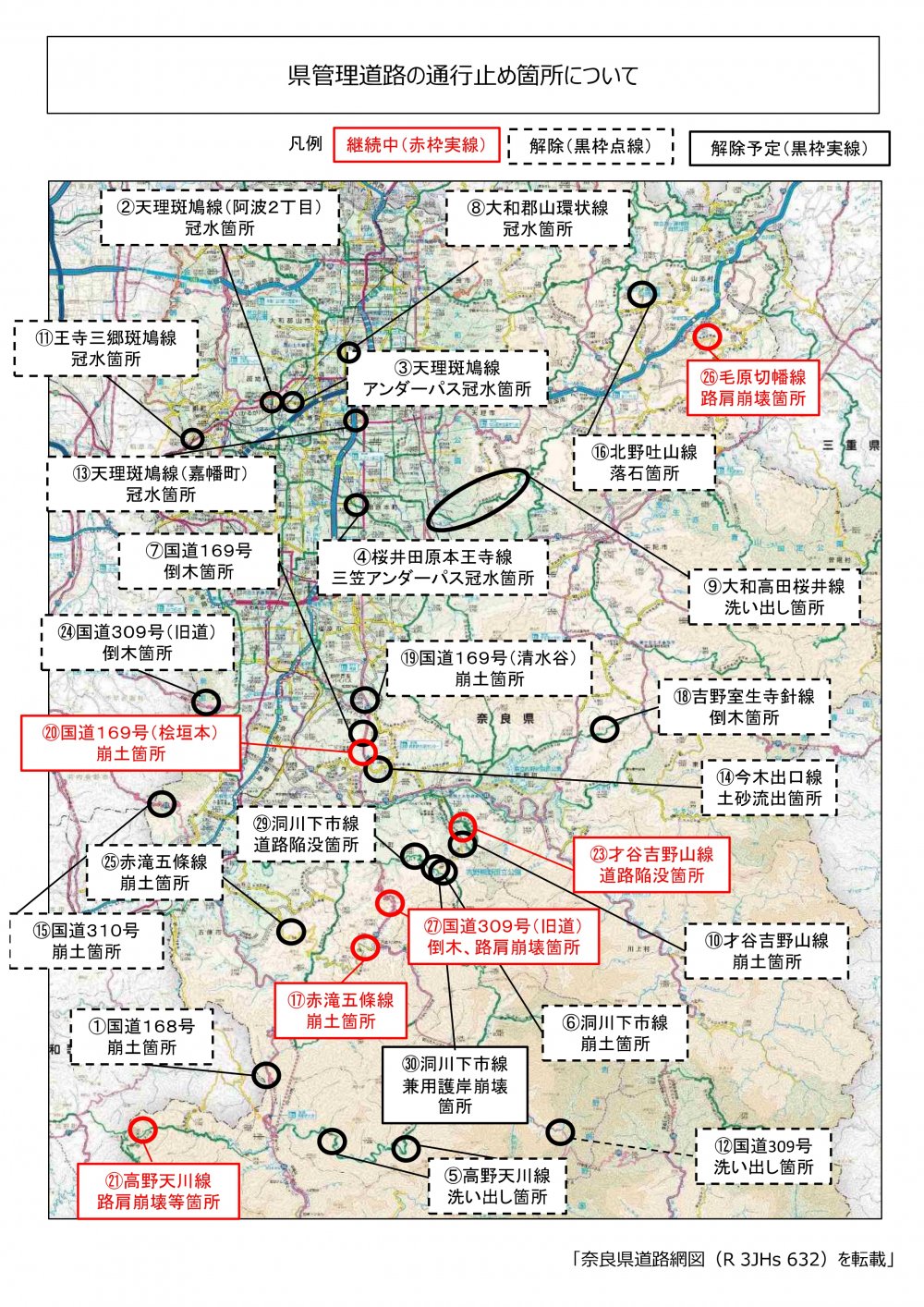 本日の午後から明朝にかけ雨予報です。いまだ地盤が緩んでいる箇所があります。お気をつけください。写真の2枚目と3枚目は現在の奈良県管理道路の通行止め箇所です。