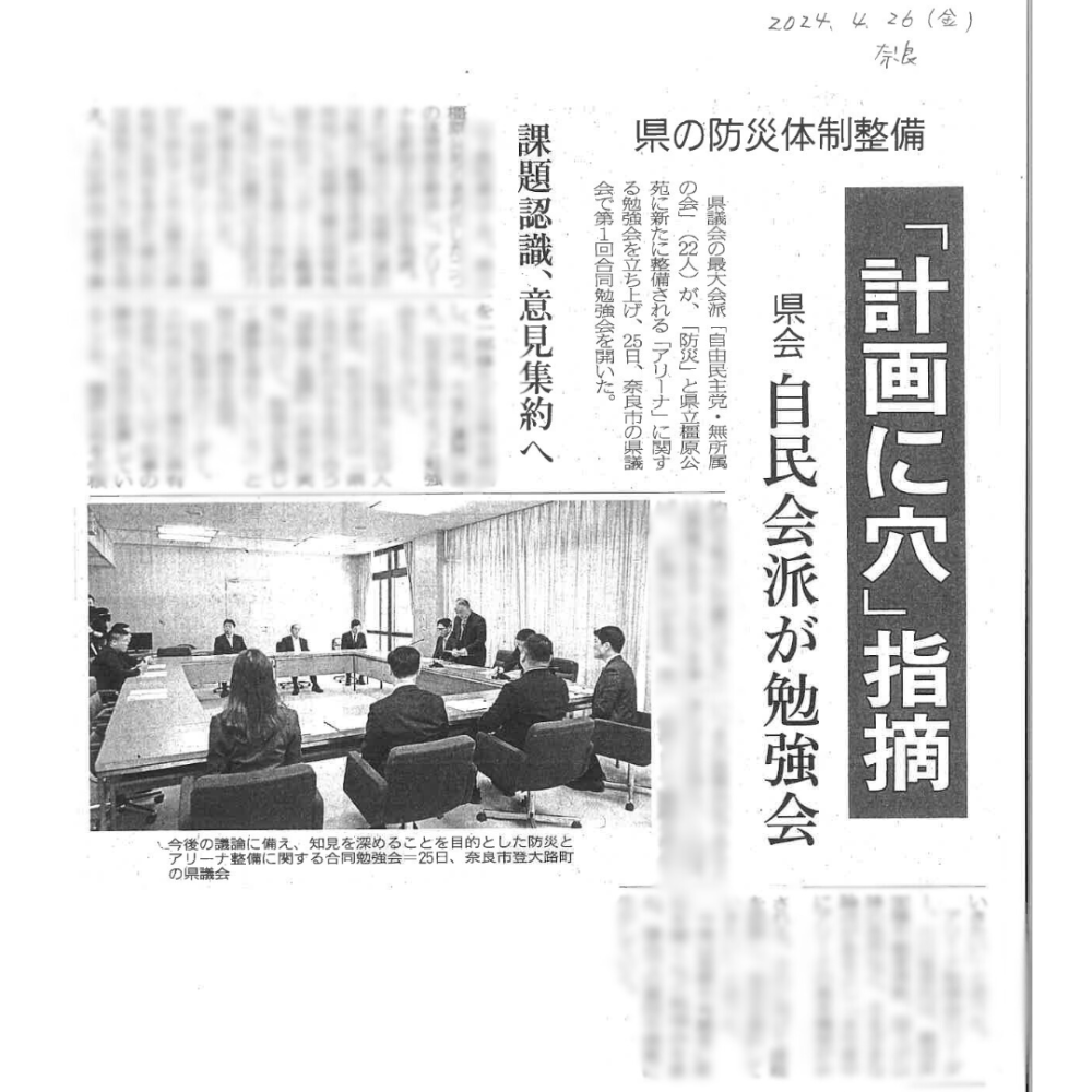 4月25日午後、奈良県議会【自由民主党・無所属の会】会派で、奈良県の防災体制と国スポに伴う体育施設整備についての第一回合同勉強会を行いました。