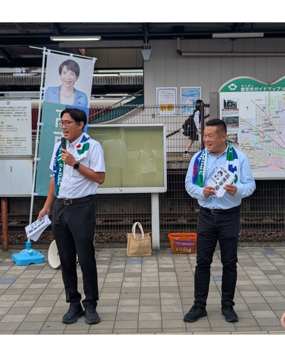 いつもは生駒郡内で駅立ちや辻立ちをしていますが、今週からは総裁選に臨んでいる高市代議士を応援するため、選挙区を飛び越えて学園前駅・大和八木駅・五位堂駅で駅立ちを行っています。